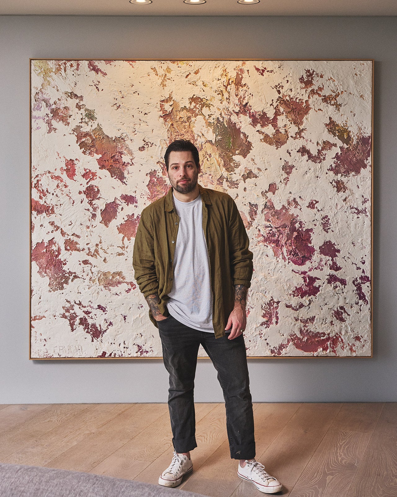 Using intuition and improvisation, Cauchi carefully layers materials, including acrylic, enamel, aerosol, oil and plaster. Each finished work intentionally conceals much of its underlying surfaces. Cauchi simultaneously builds a visual language that appears reminiscent of histories within urban environments and encourages the viewer to look beyond the final composition and question what may lie beneath. His works are highly collectible in their ability to integrate seamlessly within existing surroundings and designed interiors.